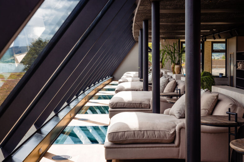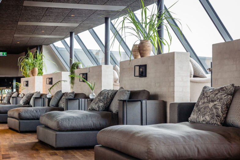 I relax-området kan du slappe af i brede divaner med vinduer op mod himlen eller slappe af i sofaer og lænestole med udsigt til centercourten. Interiøret er præget af solide materialer, naturlige farver og detaljer med et kolonialt touch.